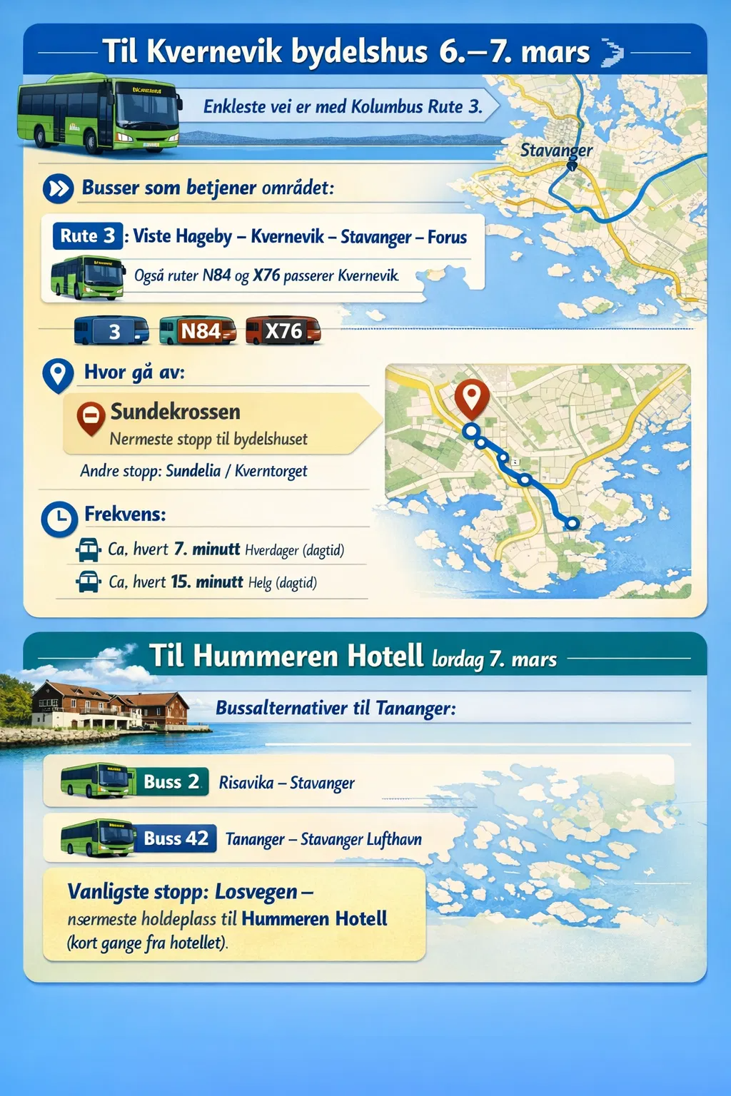 Ellers har vi laget en oversikt over de vanligste rutene og holdeplasser til Sunde/Kvernevik bydelshus og Hummeren Hotell