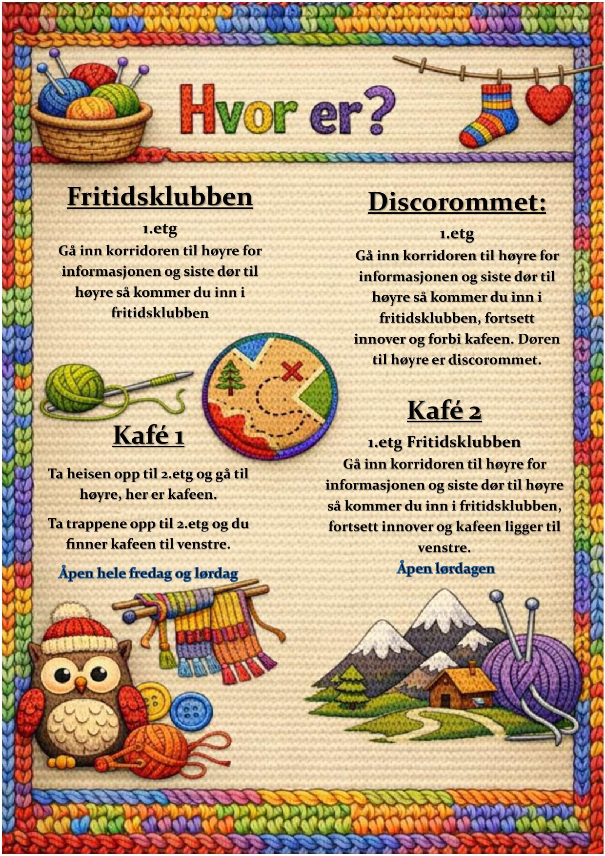 Her kommer en oversikt over hvilke rom/etg som inneholder hva på festivalen: